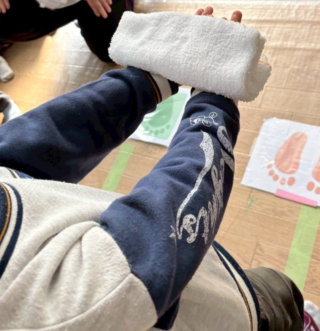 頭にタオルを乗せて歩く動作は、姿勢を意識しながら身体のバランスを保つ力を育てることを目的としています。また、「落とさないようにゆっくり歩く」という動きの中で、集中力が養われます。